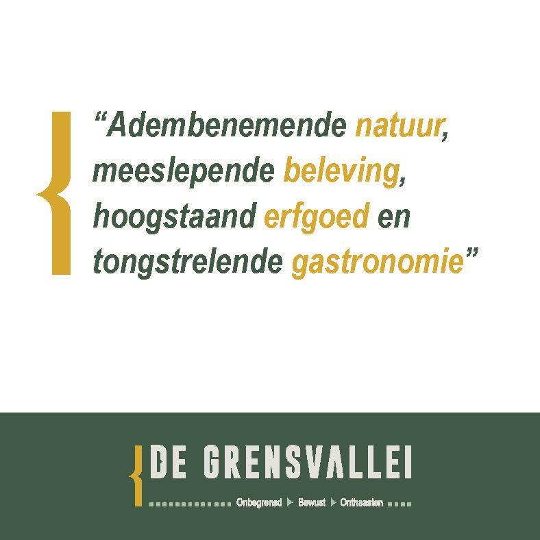 Dans le cadre de ce projet pour 'De Grensvallei' (La Vallée Frontalière), nous avons trouvé un nouveau nom pour la région, qui est basé sur les caractéristiques communes des différents partenaires. En outre, nous avons sélectionné trois adjectifs qui caractérisent ‘De Grensvallei’ et ceux-ci ont été développés comme des fils conducteurs : Illimitée. Consciente. Détendue.