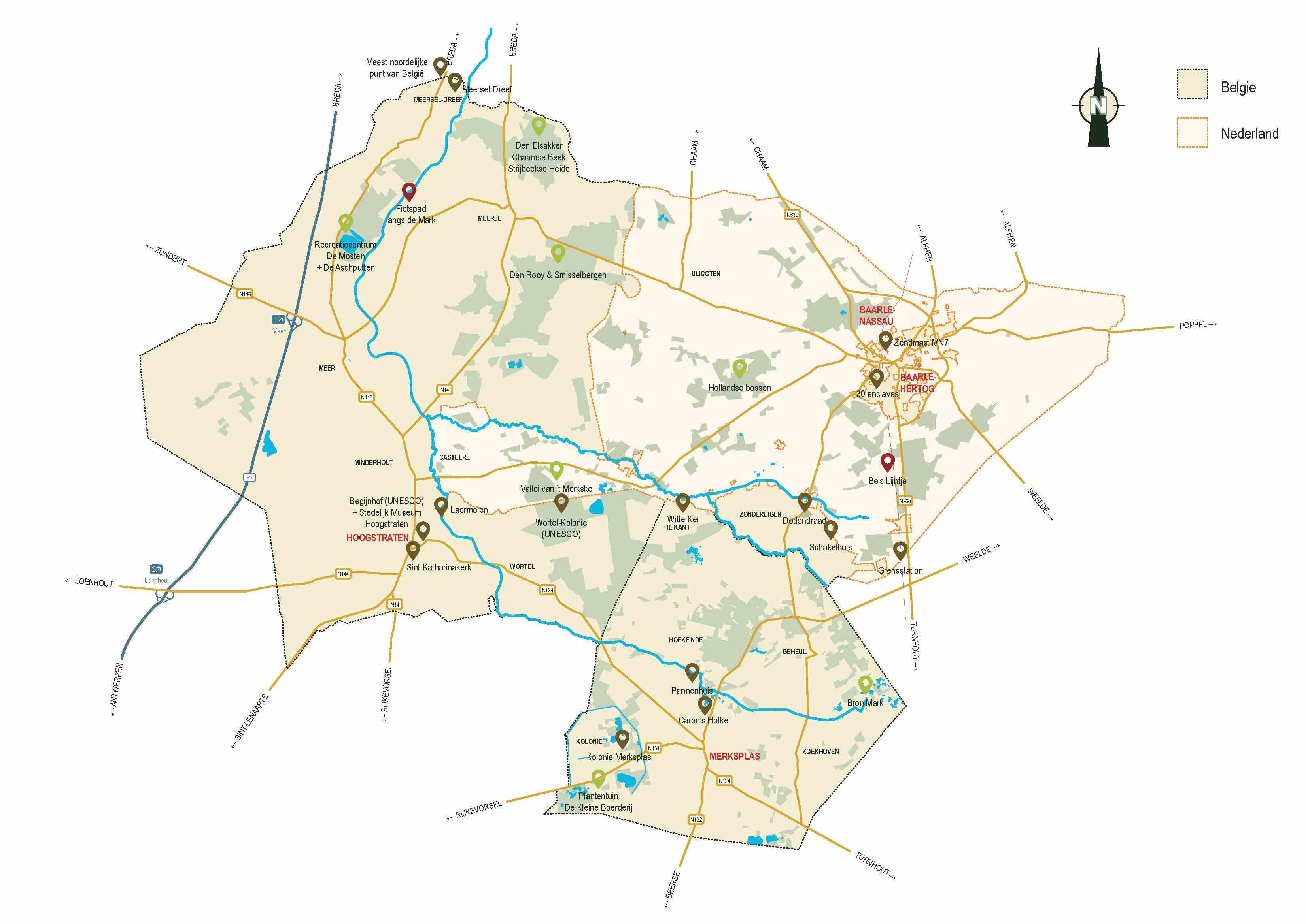 Baarle-Hertog, Baarle-Nassau, Hoogstraten et Merksplas forment ensemble une région accueillante où l'on ressent de manière unique les frontières de la Belgique et des Pays-Bas. C'est une petite zone compacte où les frontières s'estompent et où la nature est omniprésente.