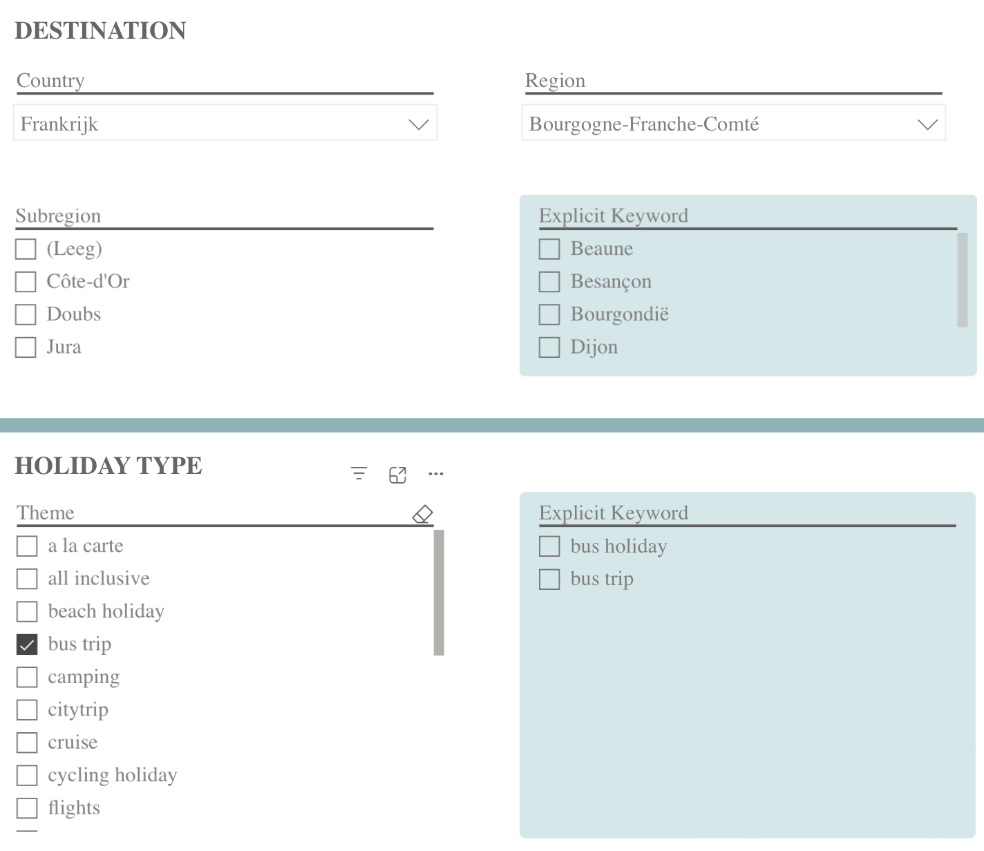 Pour mieux détecter quels agents de voyages et tour-opérateurs vendent quelle destination ou quel produit, nous avons cherché un moyen pour filtrer leurs offres. Nous avons trouvé une solution qui nous permet d’analyser l'empreinte numérique et l’offre d'une entreprise touristique. Que vendent-elles? Sur quelles destinations ou produits communiquent-elles ? Ou en d’autres termes, qu’ont-elles dans l’offre ? Nous faisons cela en analysant les sites web en fonction de mots-clés, un peu comme un Google hors ligne. Les termes de recherche basés sur des destinations, des régions ou des segments de produits nous permettent de trouver des résultats pertinents.