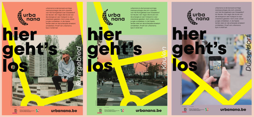 Het merk urbanana werd door de toeristische dienst van Noordrijn-Westfalen in het leven geroepen om de verstedelijkte regio van Keulen, Düsseldorf en het Ruhrgebied in de kijker te zetten, meer specifiek op het vlak van urban culture en creatief ondernemerschap. Met Thx.agency werden we in 2022 aangesteld om het merk en bijhorende aanbod bekend te maken bij een jong, cultureel georiënteerd en verstedelijkt publiek in Vlaanderen.